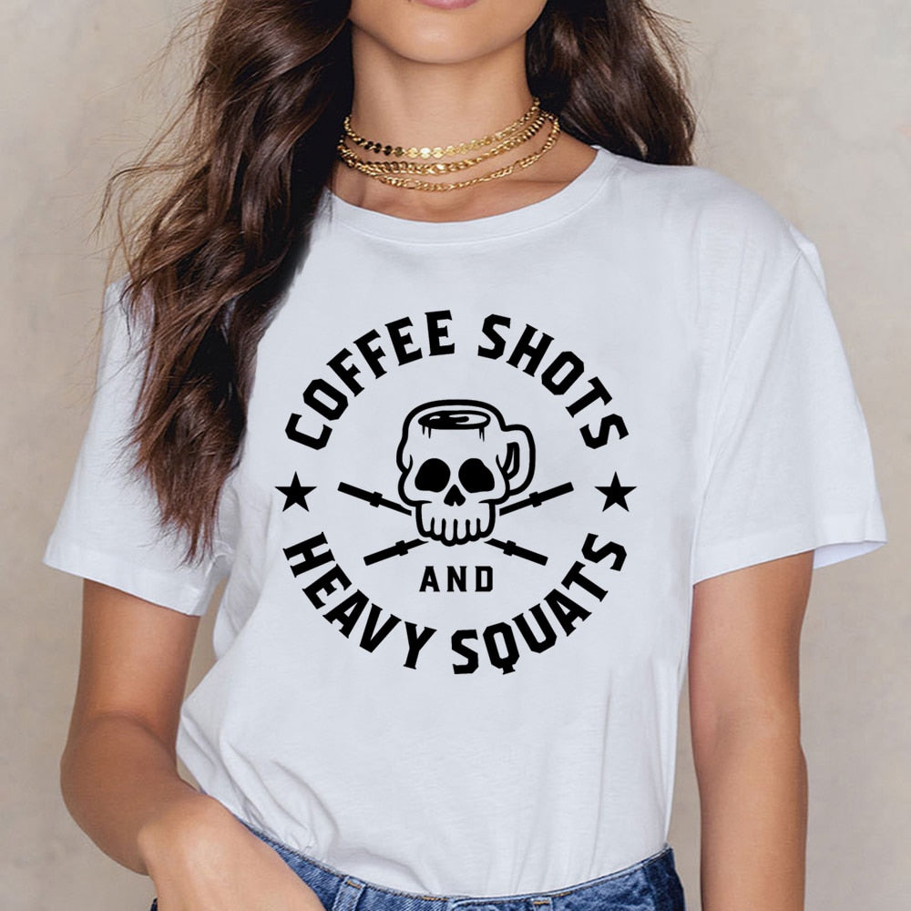 Tops T Shirt Women Coffee Shots And Heavy Squats V2 Design Black Print Female Shirt