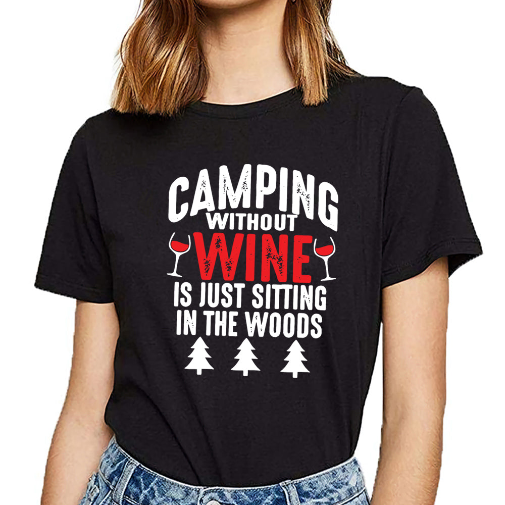 Tops T Shirt Women camping without wine Comic Inscriptions Short Female Tshirt